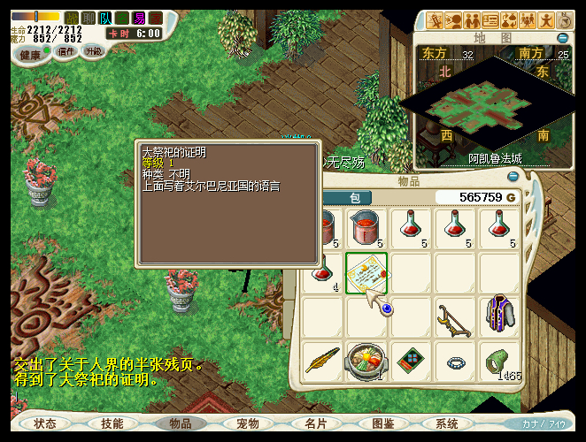 来到阿凯鲁法城皇宫,找大祭祀(31 26)对话得到物品:大祭祀的证明