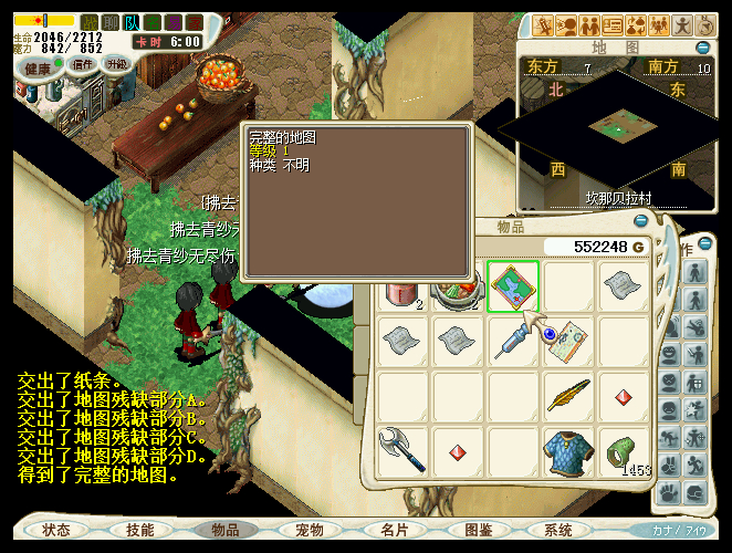 9、带着【地图残缺部分A、B、C、D】和【纸条】回去找考古学家的助手,交出所有相关道具获得【完整的地图】