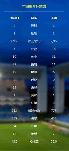 美国:3场1胜1平1负积4分,进4球丢4球,G组第二。美国2-1加纳,美国2-2葡萄牙,美国0-1德国。