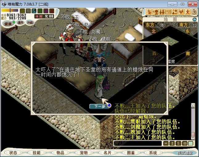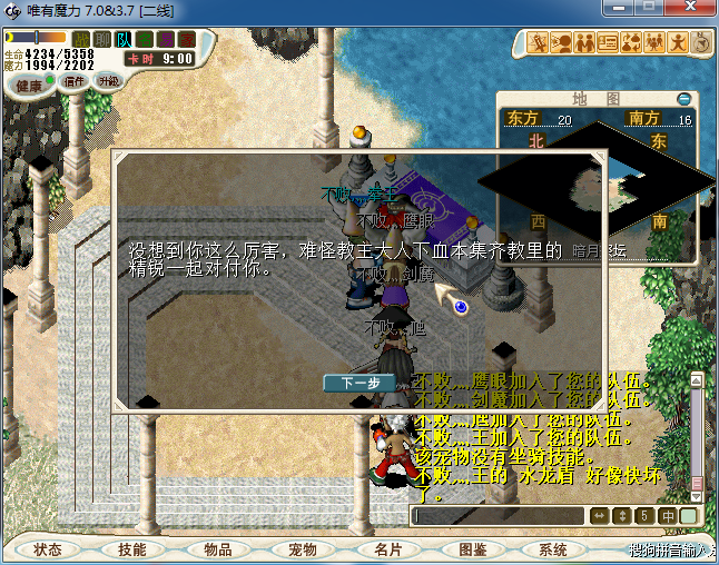 12、与暗月祭坛斗月、傲月、空月和麟月其中一位对话进入战斗(斗月单体攻击比较高。。暴击牛1700左右。。打人不知道多少。。)
