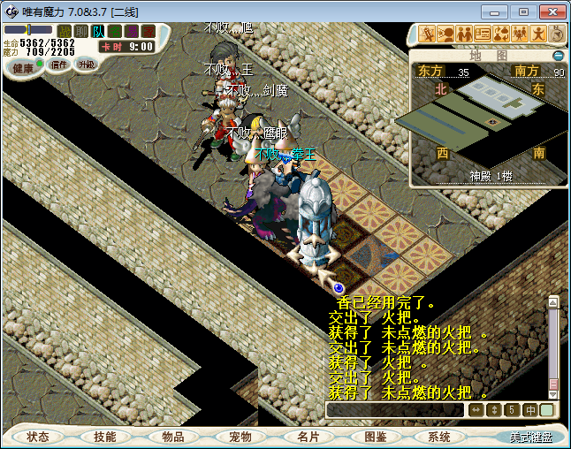 14、队长将2把火把投入52.90的火炉后回到地下圣堂 (2个人1组组队。左边的跟右边的一定要分清楚啊!然后把未点燃的火把交易给队长。点炉灶交出火把然后传送到地下圣堂。这里之前卡了好几次bug!!浪费了我3X+50个豪华寿司啊!!血1般的教训啊!子言我要补偿!!!)