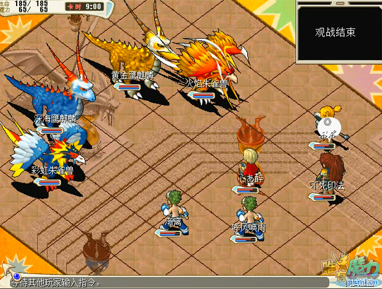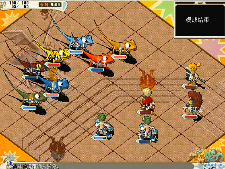 使用技能:咒术攻击、阳炎、四连击(一下80)、四属性单体魔法(400),四属性强力魔法(300)、四属性超强四魔法(200)、超强补血魔法(水蛙龙回复1200,其余回复700)、攻击吸收/反弹/无效、圣盾、气功弹