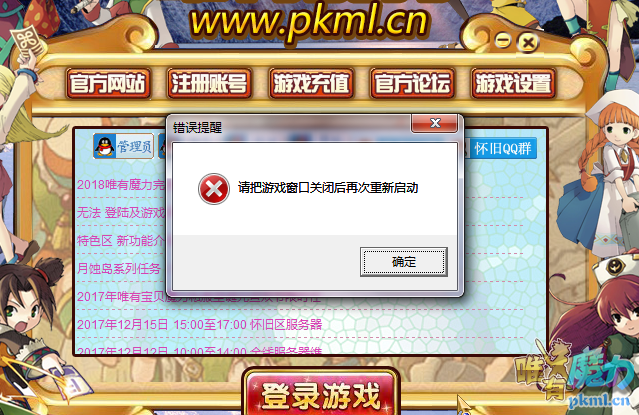 要求关门游戏窗口在打开,出现这个提示时请打开你的系统进程查看游戏中有几个唯有魔力进程,超过6个无法再打开,请关闭这些进程再开游戏,应该属于系统问题对错误关闭的进程不会自动结束。