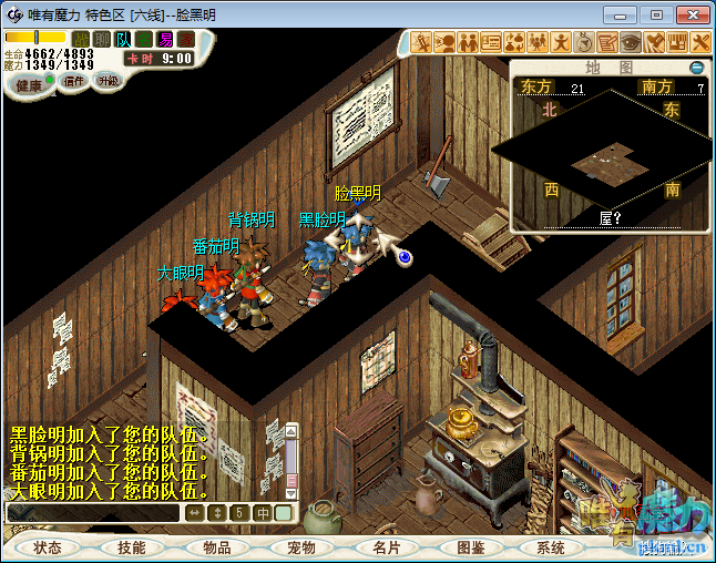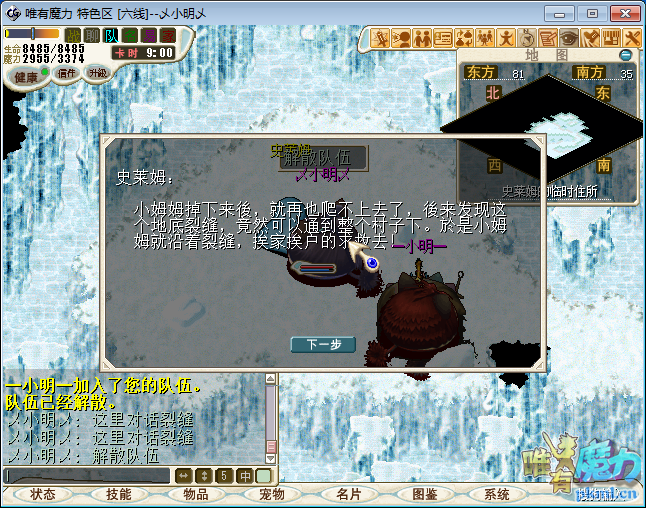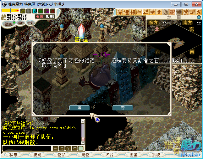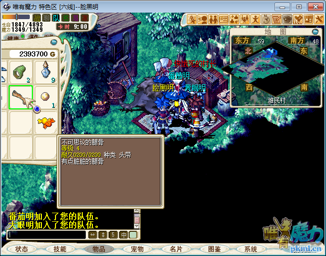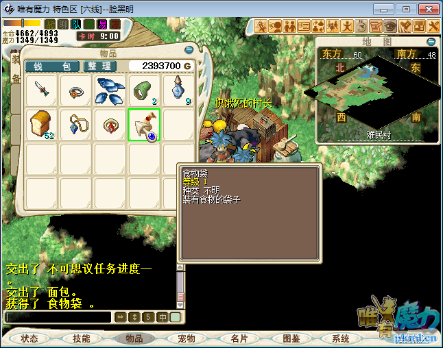 3.解散队伍.与快饿死的村长(61.48)与之对话点‘是’得到‘食物袋’,双击食物袋得到‘火焰鼠腿骨’