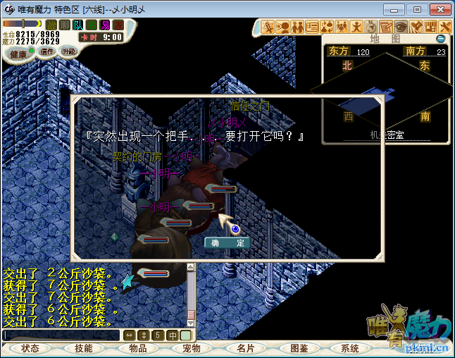 到(113,19)用30生命交换6公斤沙袋,跟(116,22)的石像说话,走到(39,37)点柱子,将6公斤沙袋放入