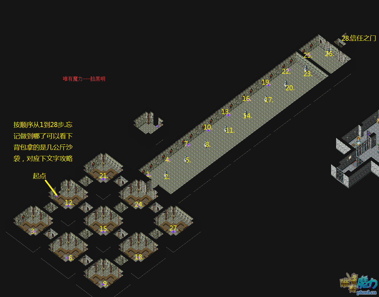 注意:所有玩家共享这一个地图,进来先去看看墙都拆完没有.能顺利出去就不要搬沙袋了.直接走.如果不能顺利出去.有玩家拆墙,建议玩家在起点位置休息放一只宠提示后来的玩家,后来的玩家看到提示跟着走别去拆墙.多个玩家拆墙会混乱.通过后把宠物收了要体谅搬沙袋玩家的辛苦。墙拆完了不要马上通过信任之门,等下搬沙袋的玩家一起过门,不然门一开通,你就过门,墙立马就封了,那玩家不是白忙活了吗?做人要厚道