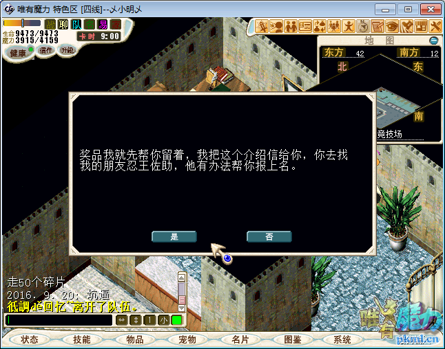 6、拿到奖杯后,与黑市老板(42.12)对话,发现是一场骗局,来报名选手都是气氛组,只有自己交了报名费,此时做选择题(12宫难度相当JJC复仇者联盟,谨慎选择)选择【否】,获得【黑大老礼包】(3天后开启,任务结束)。选择【是】再给他50个金币(创意区50个梦幻碎片)拿【十二星座挑战介绍信】。任务BUG:要51碎片触发,但只收了我50(可宠邮)(注:该步骤如果没有选择领取礼包 或者 拿挑战介绍信,登出离开后无法重新进入,需要重新任务)