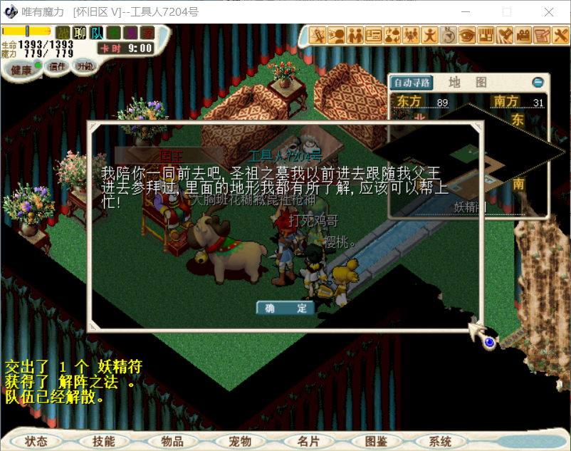 【之六宣珑城之乱】 1. 到宣珑城王宫与国王对话得到阴阳镜。 2. 与宣珑城大臣府的门侍对话进入大臣府。 3. 与大臣府的事务大臣对话传送至后花园。 4. 走到后花园庭院与事务大臣对话后切换场景。 5. 与黑暗复仇者对话进入战斗。(注:2连战) 6. 胜利后与茉莉公主对话传送,然后顺着路走回到王宫。 7. 与王宫的亲卫队队长对话进入王宫内层。 8. 从内层进入密室,然后进入到王宫逃脱的密道。 9. 顺着密道走,到中间与亲卫队队长对话传送然后继续走至尽头。 10. 与尽头的茉莉公主对话得到地图并传回乌鲁克雅。 11. 到乌鲁克雅中部的巨树·桑前面调查接引之树选是进入巨树。 12. 进入巨树迷宫到达第10层,与追击的阿修罗一族对话进入战斗。 13. 胜利后再次与追击的阿修罗一族对话传送。 14. 与妖精战斗团团长对话后传送再往前走继续爬迷宫。 15. 到达巨树顶层与妖精战斗团团长对话得到觐见函 并传送至妖精阁。 16. 与妖精阁的妖精女王对话得到妖精符。