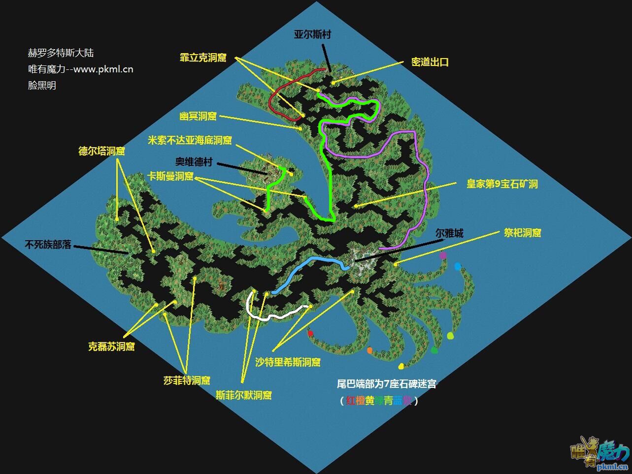 3、这么计划的:这是新大陆的全貌:第一站亚尔斯村补给一下,走紫色线到尔雅城门口练49级的宠然后沿紫色线 ...
