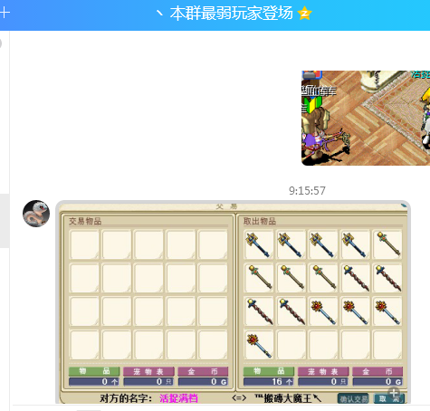 6、在群里收法师装备时,玩儿家:本群最弱玩家登场,送了7、8、9级基本全满的12把法仗。
