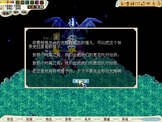 最后得到1级宠物恶魔蝙蝠和称号"闪耀者",传送回召唤之间,任务完成