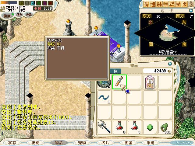 给女巫水龙料理X1、鳖料理X5和生命力回复药(1000) X5,得到恋爱药水
